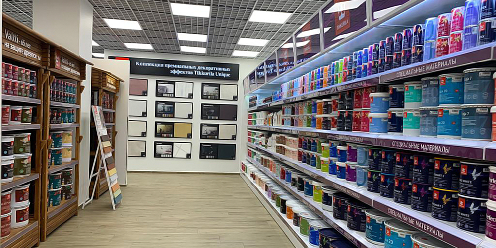 Огромная линейка материалов Tikkurila, Finncolor и ТЕКС, многообразие выкрасов, каталогов цветов и вееров, необходимые для работы инструменты в уютной атмосфере современного магазина - то, что нужно искушенному покупателю для идеального ремонта.